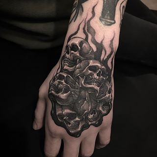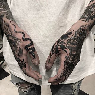 (Beautiful set of hands with skulls, webs, flowers, and snakes.)