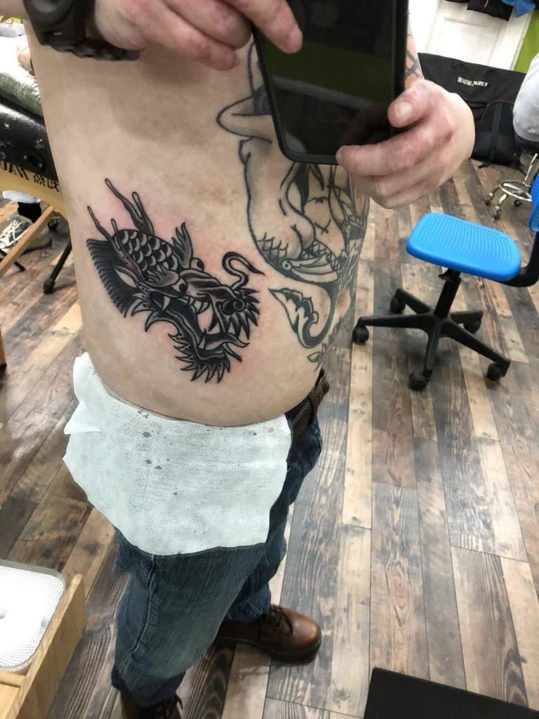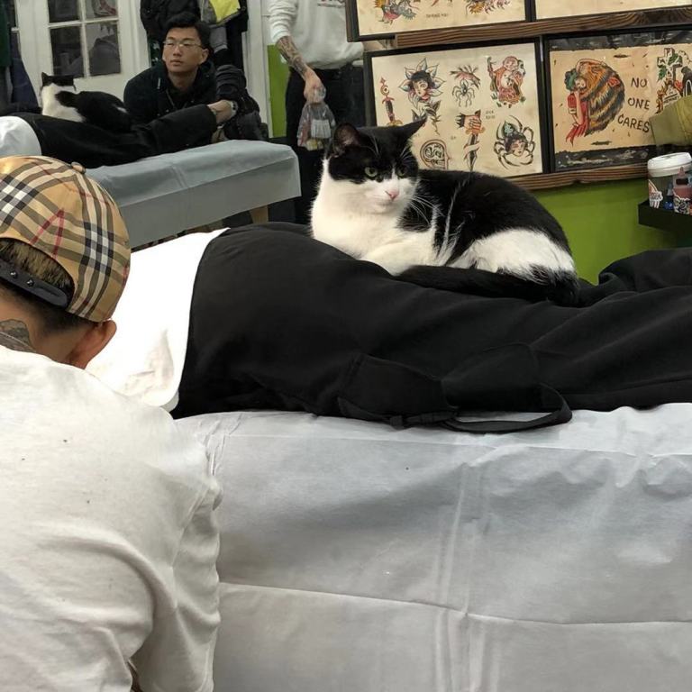 I had my ribs tattooed, which took around three hours, and he made it as good an experience as possible, considering the painful placement. I also had one of the shop cats sleeping on me for most of my experience, which was a good distraction. Back in the West cats wouldn’t be allowed into shops, but here in China you come to expect the unexpected. The shop did follow all other health protocols, such as using new needles and ink, and wearing gloves the whole time. This is important to check as I know many shops in China don’t follow Western health standards as closely. Since Sick Rose followed everything else by the book I was able to overlook the shop cats since I had followed them for so long and seen the healed results, with no issues. On day four now and my own piece is healing nicely.