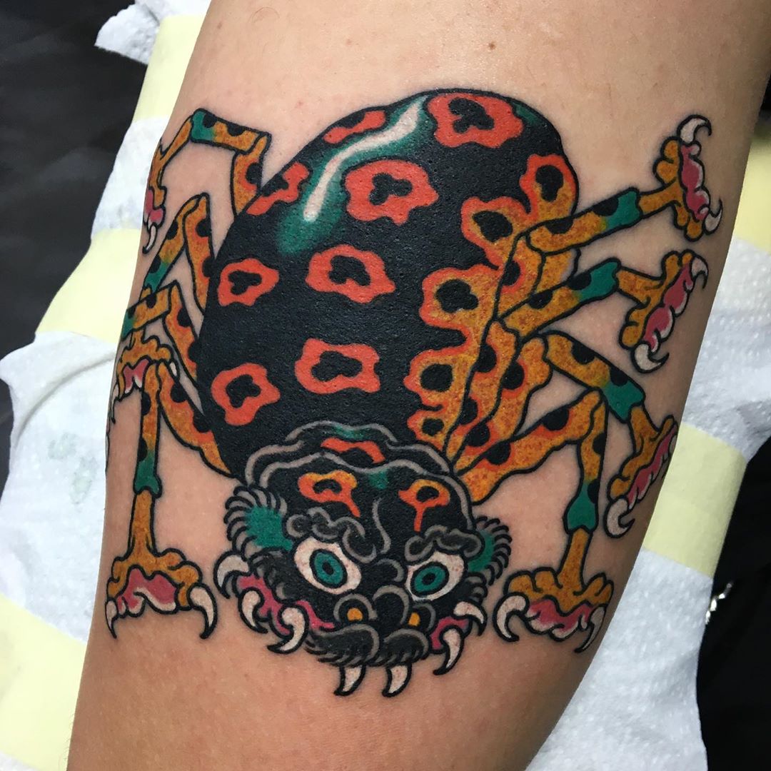 As a tattoo, Tsuchigumo is usually done in a traditional Japanese style, as it comes from Japanese folklore. Though it can also be done with a more American traditional twist, Neo-traditional, or realistic style. It pairs well with Japanese warriors, or as fillers with webs, skulls, or flowers.