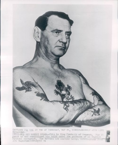 In Burchett’s “Memoirs of a Tattooist” he states that “I have tattooed the subjects of six sovereigns, starting with portraits of Queen Victoria. The tradition has been maintained and still seemed to be strong when I prepared the designs for the coronation of 1953.” He also reminisces about tattooing The Duke of Saxe-Coburg-Gotha, one of Queen Victoria’s favorite nephews, Prince Christian Victor, a grandson of Queen Victoria, and King GeorgeV. Along with English royalty he also tattooed King Alfonso XIII of Spain, and King Frederick IX of Denmark.