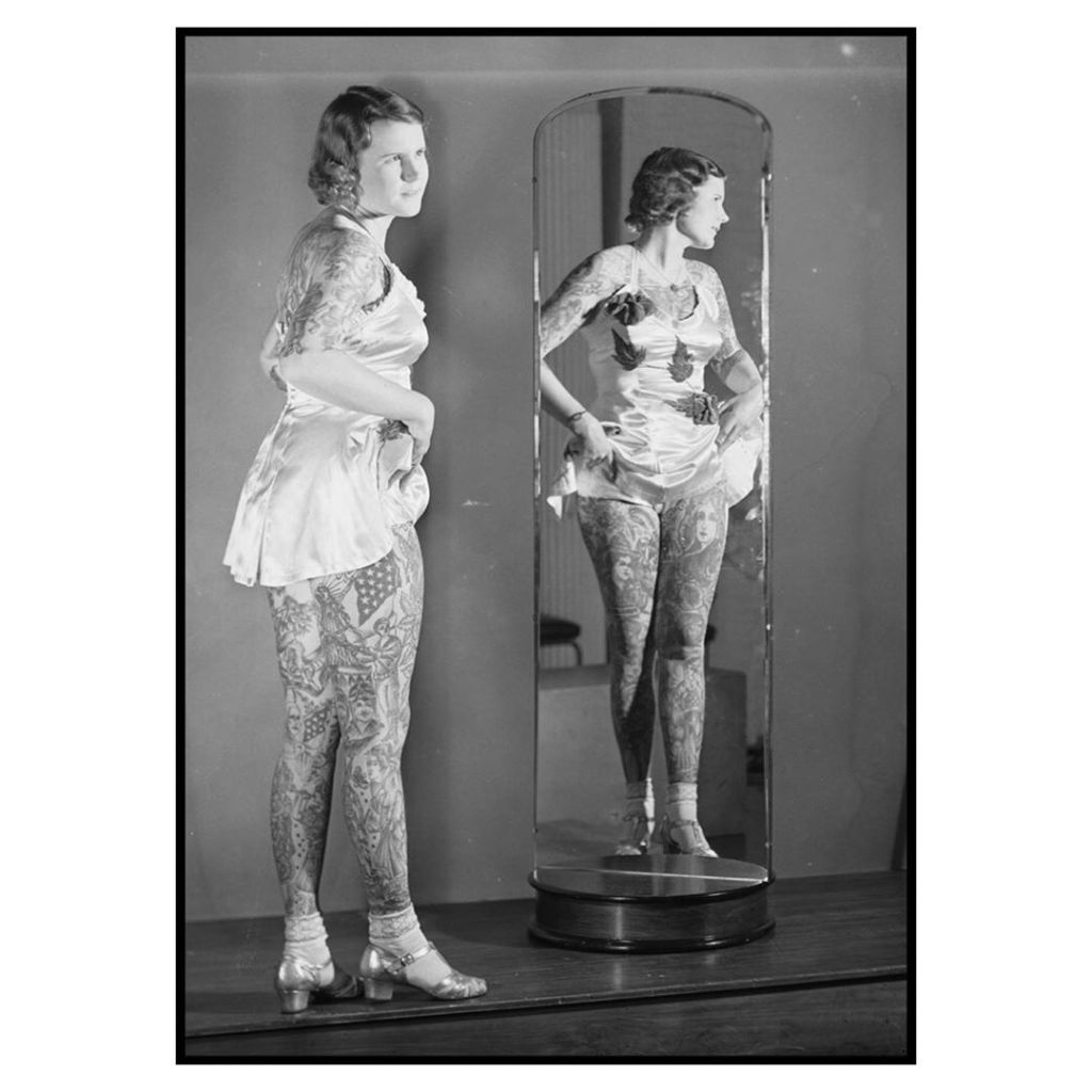 Artoria (Anne) Gibbons is another well known tattooed lady. She worked for over 30 years in circuses and sideshows in the early 1900’s including Barnum and Bailey’s, the Ringling Brothers, and others. She met Charles “Red” Gibbons, an already well known tattooer, and the two eventually married. After being married for 4-5 years, Red started tattooing Anne, and she became almost like a business card or canvas to showcase his work. She was apparently so beautiful, and the tattoos on her body so well done, that she stole the show wherever she went. In an interview in 1934, Anne said that she was often asked if she was born that way (seriously). From medieval times to the mid 1900’s many people believed in the “mark of impression,” that something the mother had done or seen would leave a physical mark on the baby. Doctors legitimately thought that her mother had watched too many movies while she was pregnant with Anne and that’s why she was covered in images.