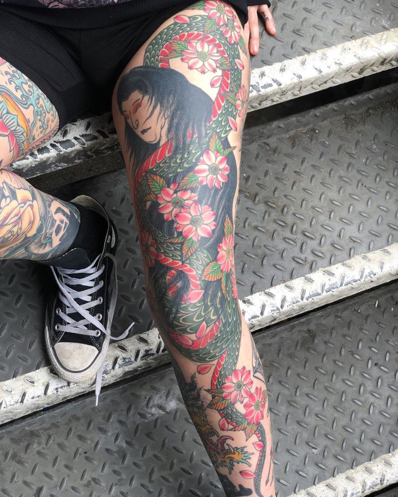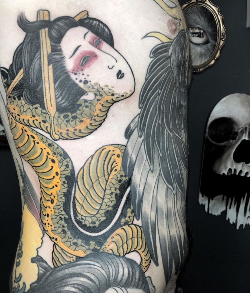 Nure-Onna snake lady tattoos are another design that can be worn as a kind of armour, as we now know Nure-Onna is a force to be reckoned with! She’s also more creepy looking than Medusa, so for horror aficionados she’s a cool choice. For those who also enjoy Japanese tattooing, Nure-Onna can be paired with Japanese flowers, and background such as waves or clouds as she is a creature from the sea.