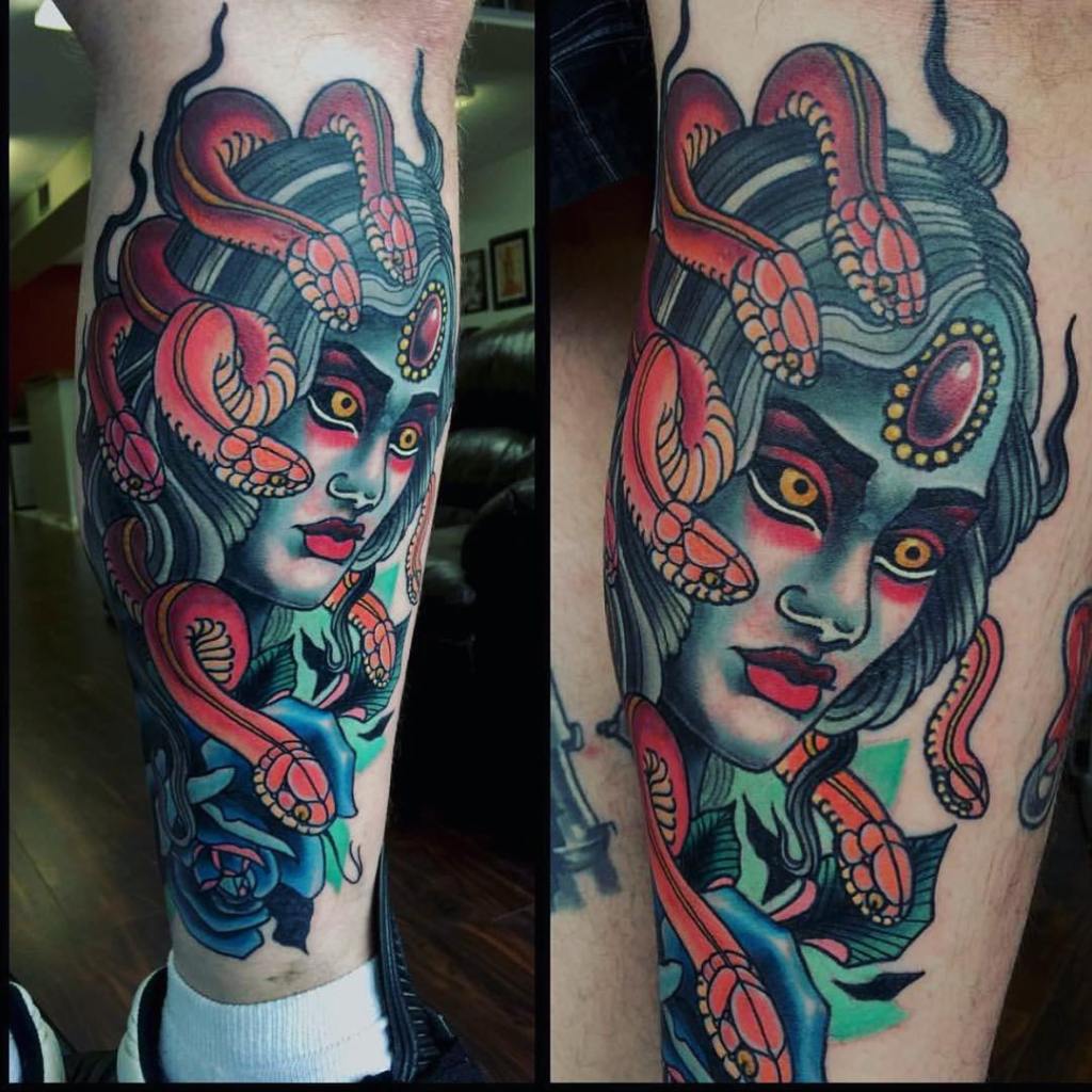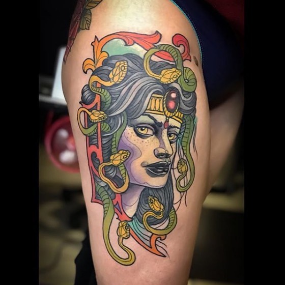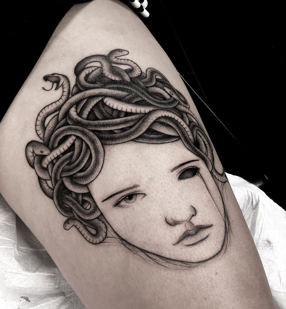 Let’s have a look at our first snake lady Medusa, and why people might get snake lady tattoos of her. Medusa is immediately recognizable and is seen in all kinds of pop culture. At a glance, Medusa looks like a terrifying monster, but her character is much more complicated than that. According to Ovin’s Metamorphoses, Medusa wasn’t always the monster that she’s usually seen as. Medusa, one of the three Gorgon sisters, and the only mortal one, was extremely beautiful. So beautiful in fact, that she caught the eye of the god of sea, earthquakes, and horses, Poseidon. Turns out Poseidon was a real scum bag and actually raped Medusa in the temple of Athena. When Athena found out what had happened in her temple, she got angry at the wrong person and cursed Medusa for desecrating her holy space.