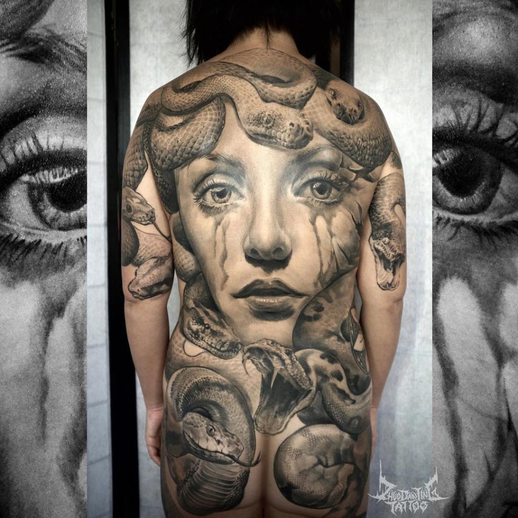 Our second snake lady and corresponding snake lady tattoos, Nure-Onna, comes from Japan. The name Nure-Onna means, “wet woman.” As such, I’ll give you three guesses as to where she lives, and the first two don’t count. Quite simply, the water; coasts, rivers, and lakes. Really any body of natural water that can fit a giant snake lady. Traditionally she is native to Kyushu, Japan’s south-westernmost of the main island’s. But she can also be found as far north as Niigata and farther east in infamous Fukushima. Now unlike Medusa, Nure-Onna was never human, she’s pure creature, though not necessarily “evil.” She’s described as being large enough to flatten trees with her tail, strong enough to overpower men and eat them, and is quite a fast swimmer. In some legends she has arms like a human, and in others the only human thing about her is her head, plopped on top of a snakes body. Though all legends describe her face as quite snake-like, forked tongue and all. According to some legends, she really just wants to be left alone as she’s quite solitary and goal oriented. Usually coming ashore to wash her hair and eat. Her diet consists of both blood and entrails (delicious), but not specifically human blood and entrails, though don’t piss her off and test that. Now even though she’s way stronger than you or me, she doesn’t like to rely on brute strength when she is in the mood for some man meat. She’s smart and tricky. Nure-Onna uses magic to disguise herself as a distressed woman carrying a crying baby. She herself cries out for help from passing fishermen, sailors, or anyone unlucky enough to be passing by. If someone does stop to help her, she convinces them to take the baby, just for a moment, to let her rest. If she gets that far, the fake baby magically becomes extremely heavy, and she changes back into a snake lady, drains their blood, and eats their guts.