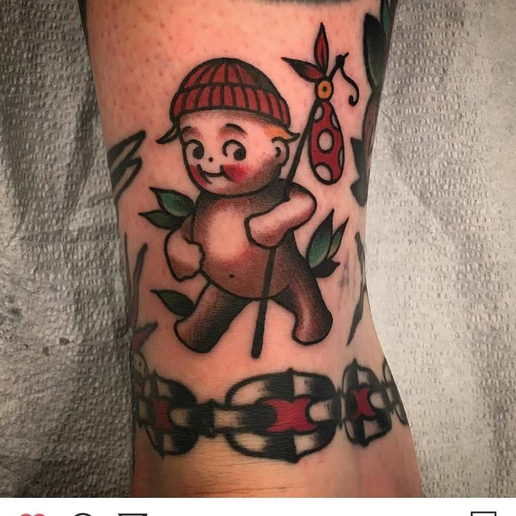 While most Kewpies were nude, in the 1920’s they started being made with clothing and uniforms such as firemen, cowboys, soldiers, musicians, and more. Today, as tattoos these impish characters are usually still done in an old school American traditional style, and feature most of the same original features previously listed. Many artists get creative and turn famous celebrities or characters into Kewpies, or make them a bit darker by giving them weapons or even making them into horror icons.