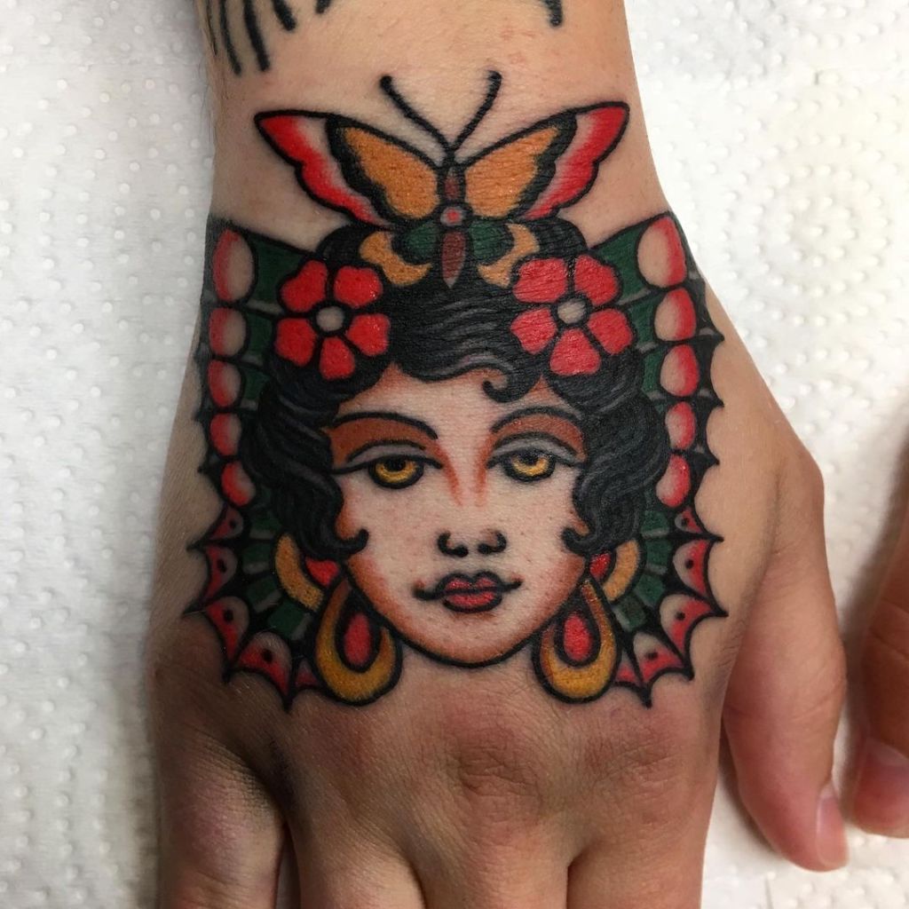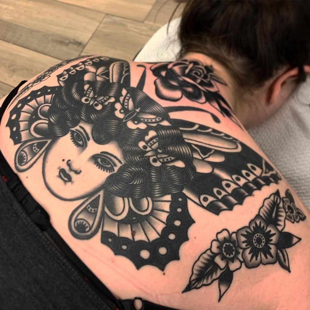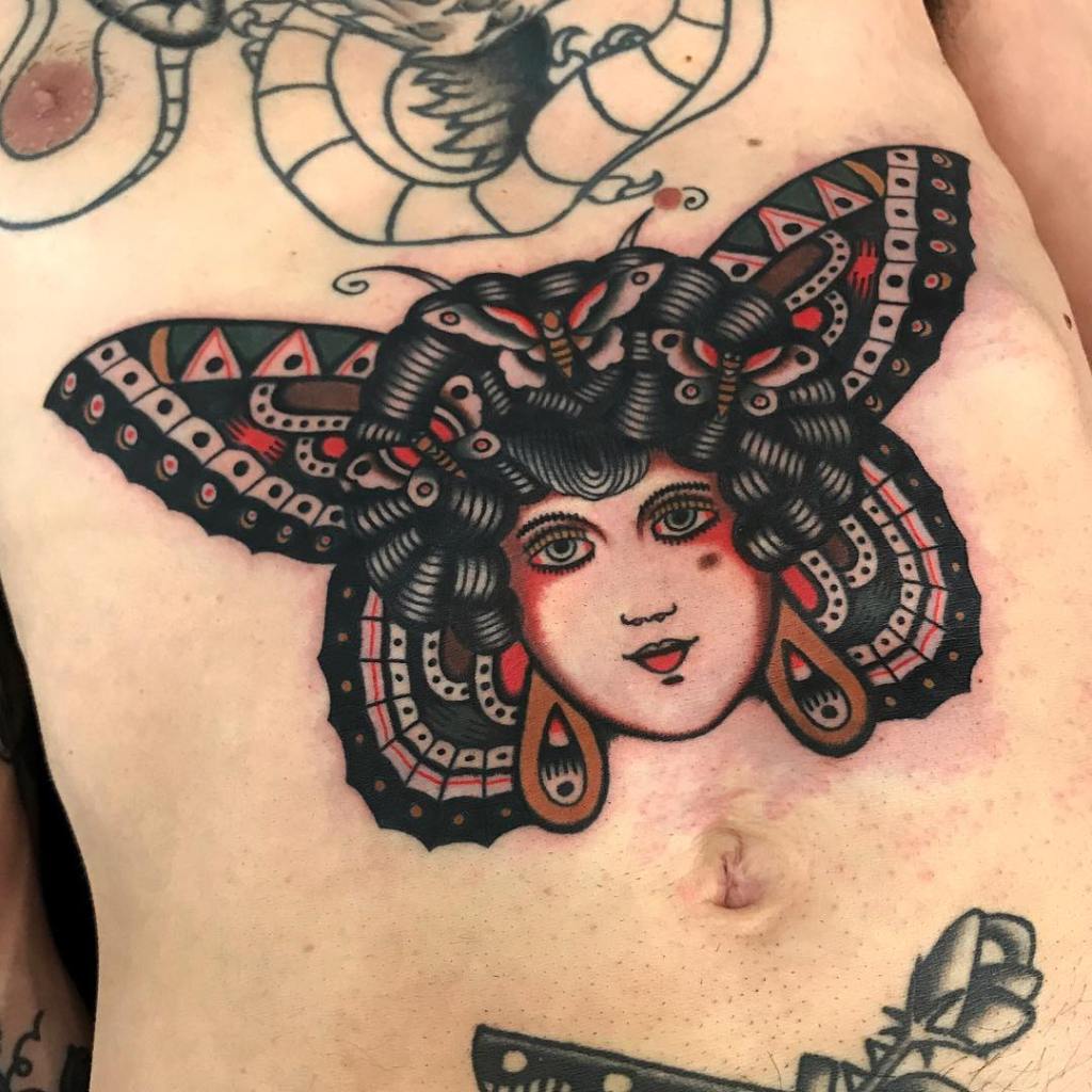 One of the most popular ways for this design to be tattooed is a woman’s head with butterfly wings sprouting from behind, to the left and right.