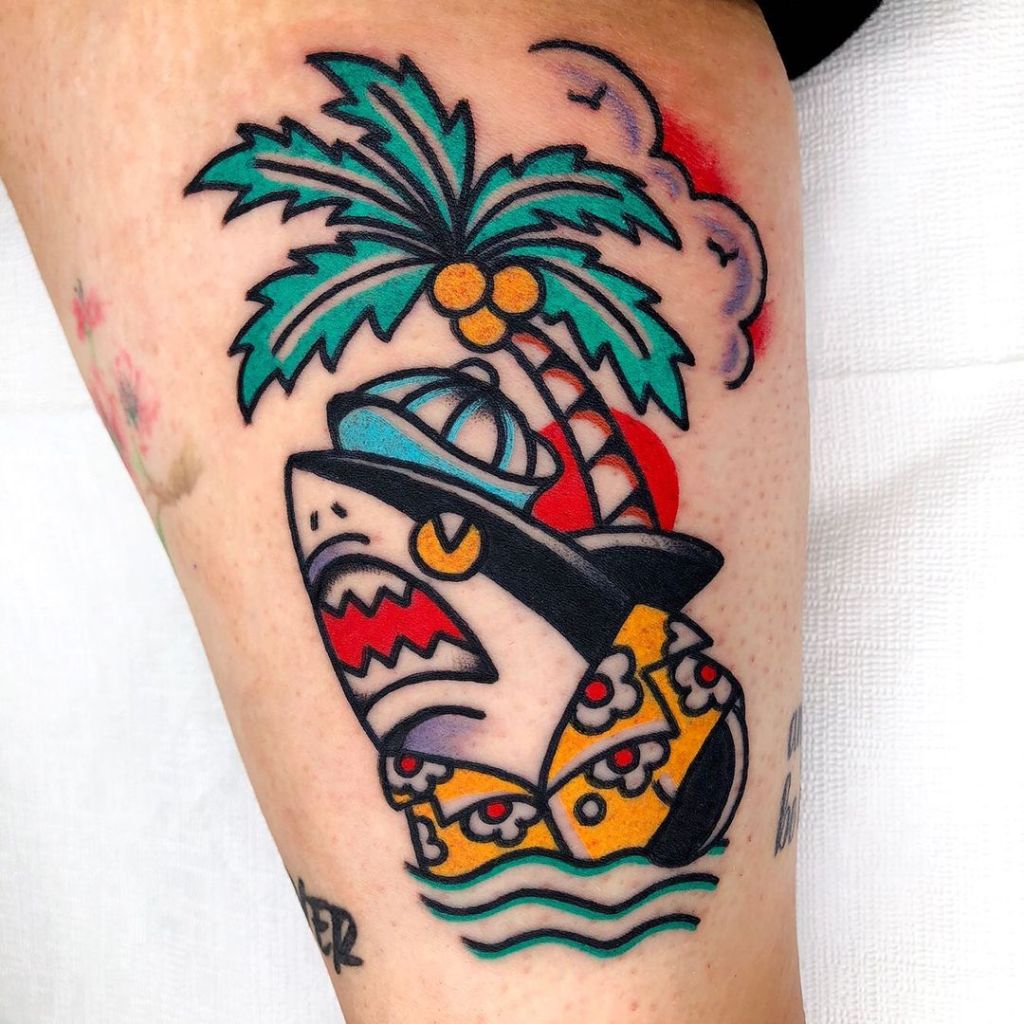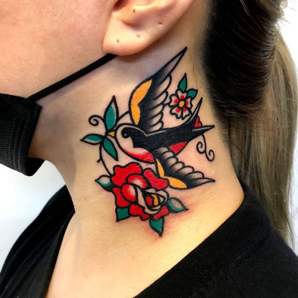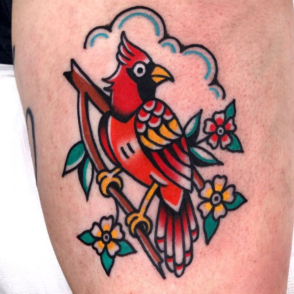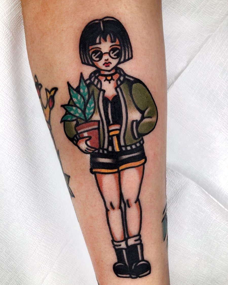 She tattoos in a hybrid style of old school and new school. Her old school techniques consist of thick bold lines and the classic colour scheme, with an added almost cartoon-ish look.