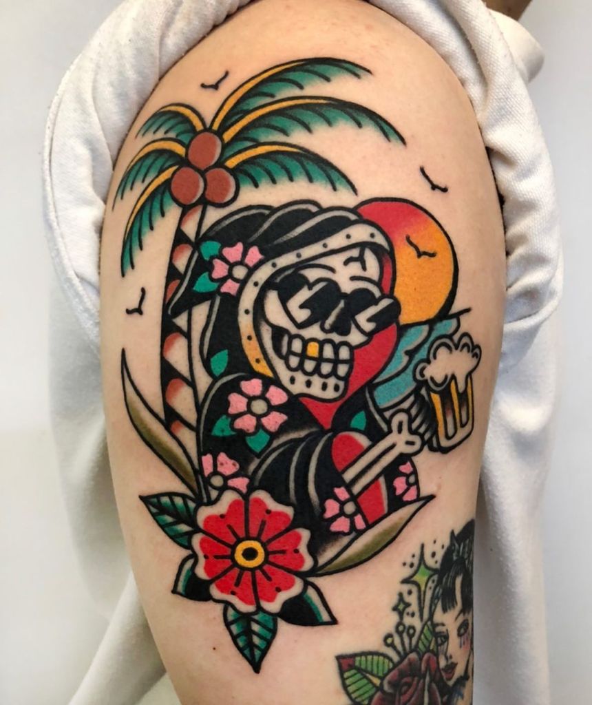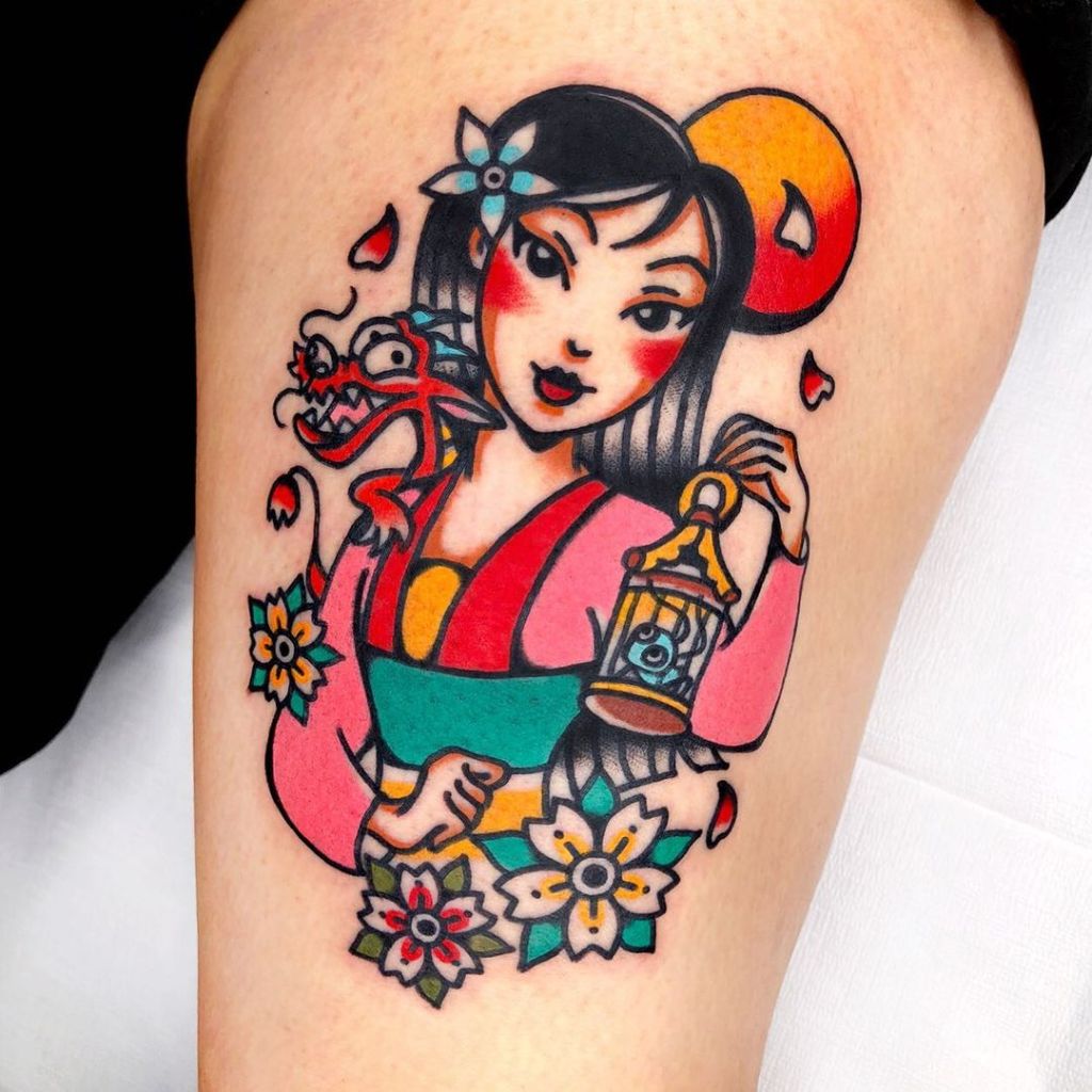Lots of her work features cartoon characters from popular Disney movies and shows like Mickey and Minnie, Moana, Mulan, and more. Her Instagram is also full of old school classics like swallows, reapers, skulls, pinups, and lady heads.