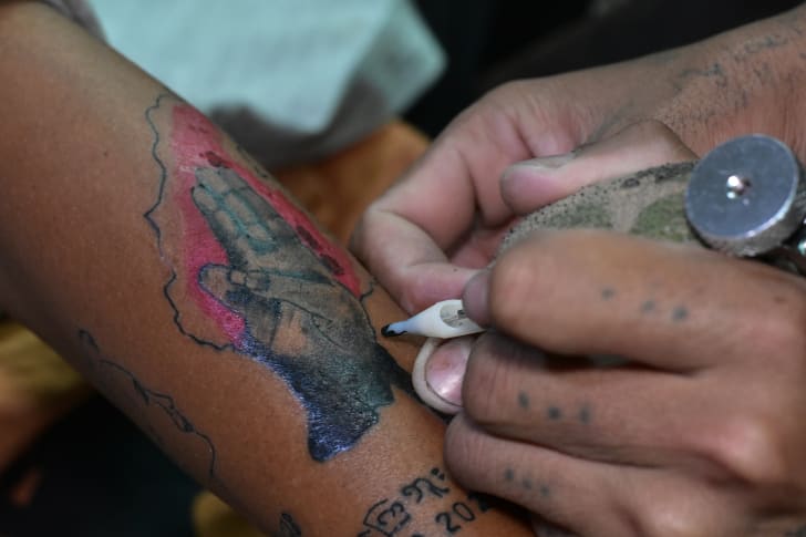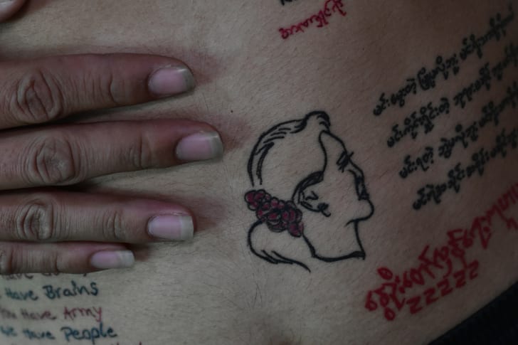 Eight tattoo artists worked on dozens of protestors during the all-day event. They kept designs small and from flash tattoos already pre-made. The small pieces were designed for speed and to convey a message of unity. The options given were: the face of ousted leader Aung San Suu Kyi, the words “Spring revolution,” the phrase “Kabar Ma Kyay Bu” (which references a protest song and means “we will not forget until the end of the world”) and the well known “three-finger salute,” from “The Hunger Games” movies which has been adopted in Myanmar and Thailand as a symbol of protest and rebellion. The finger salute is often used at protests as well, but the most popular tattoo design here is the outline of Suu Kyi’s face.
