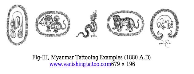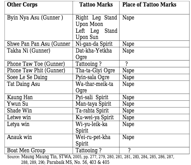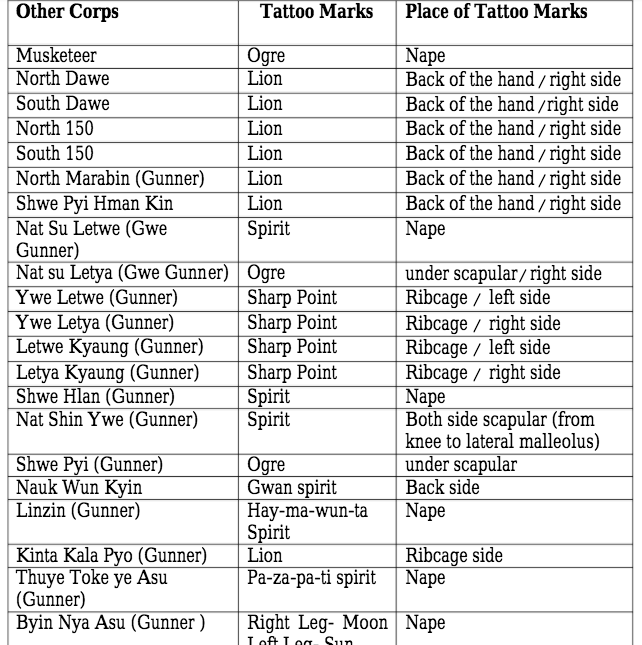 Information from “Tattoo Art in Myanmar Culture: Special Reference with State Bondsmen of Cavalry Corps 2016” written by Moe Moe Oo from the Ministry of Education, Myanmar, and