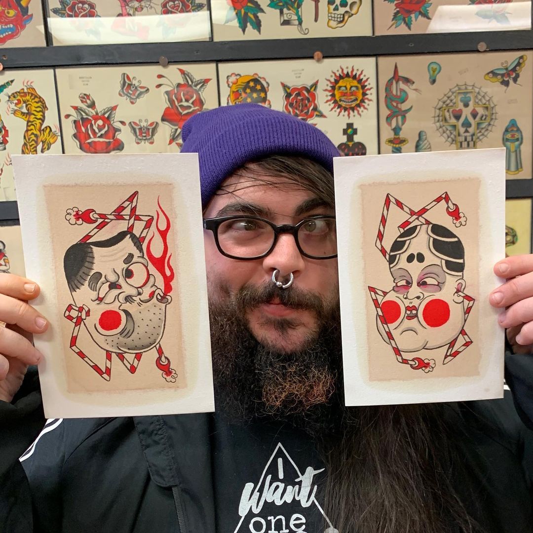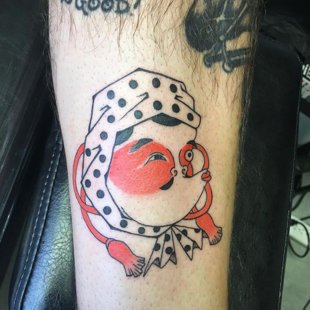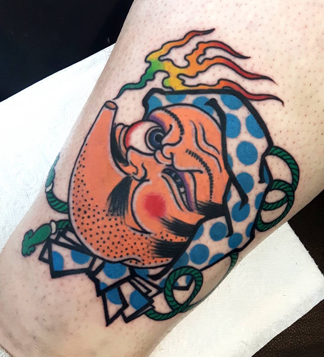 He is a kind peasant spirit who according to legend could remove gold from his navel and spit fire through a bamboo tube that he always brings with him. This tube is also why he is usually depicted with pursed lips as though perpetually ready to blow fire through his tube. He is also described as a drunkard who enjoys dancing and parties. The handkerchief around his head is also a nod towards him being a drunk as toothaches were common from drinking too much.