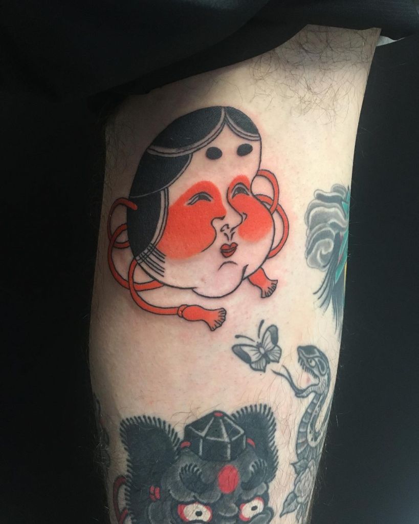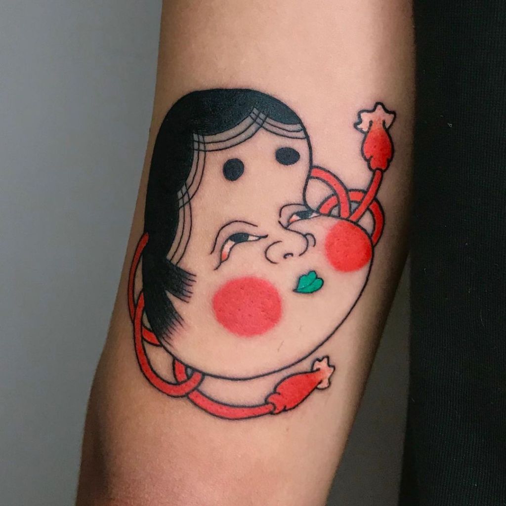 Okame is a female character (also sometimes called Otafuku) with a smiling face and large cheeks. She also has white makeup and red lips, in the style of a geisha.