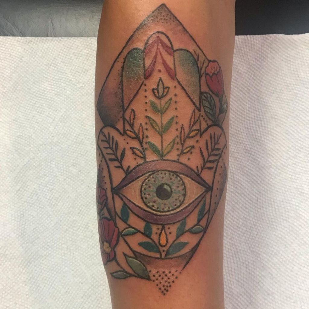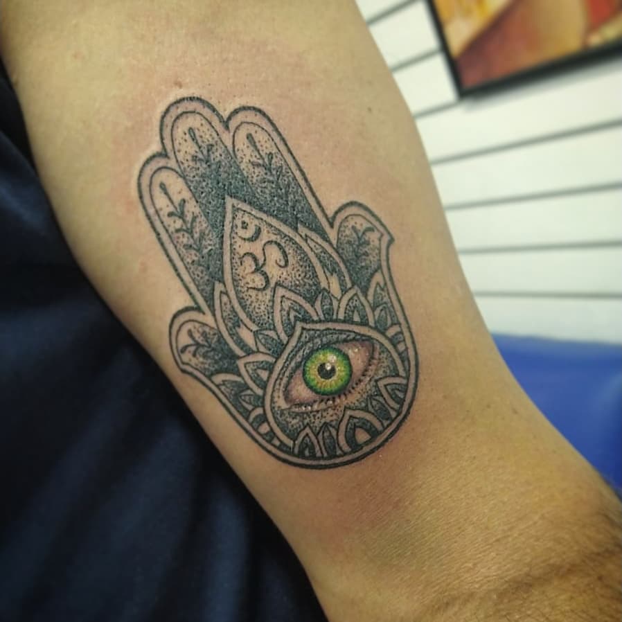 As a tattoo the Hamsa is often done in a black and grey or fine line, but neo-traditional and geometric patters thrown into the mix are also popular. Many people wonder if it’s ok for them to wear a Hamsa, whether it’s a tattoo, on a necklace, or a t-shirt, and the short answer is yes. It can be culturally insensitive to wear it without understanding what it means, but as so many religions and cultures have ties to it, it really can be for anyone, as protection is a universal theme.