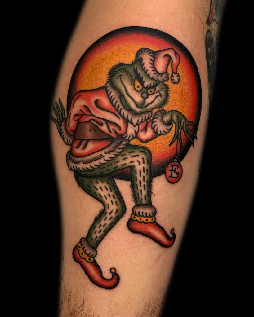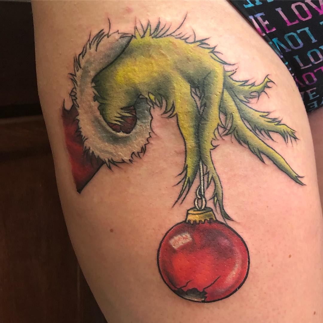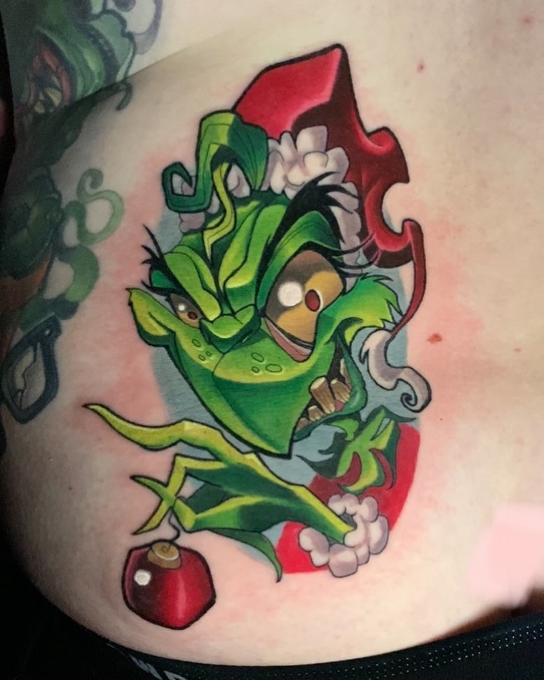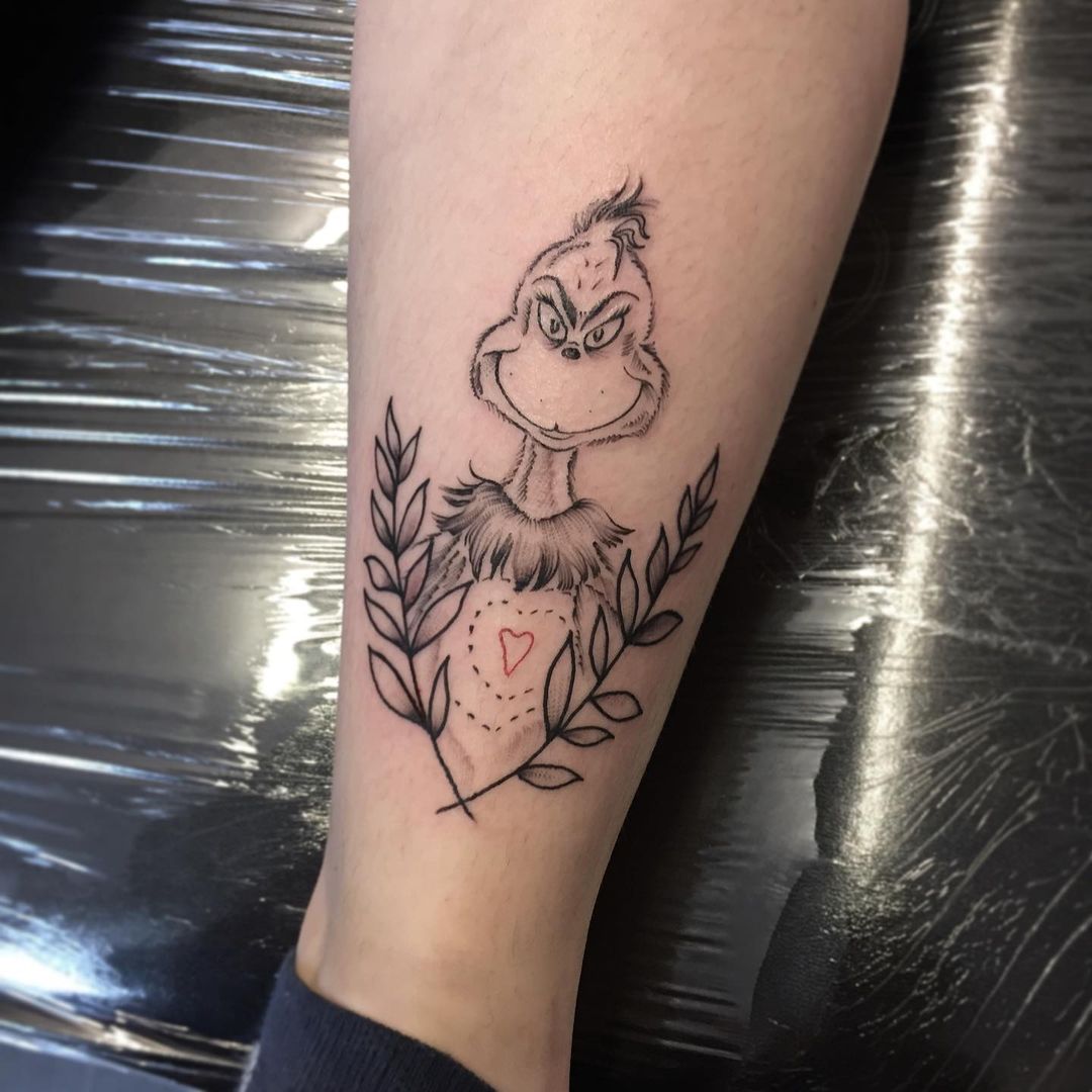 The Grinch; one of Christmases most beloved fictional characters is also a popular choice for holiday themed tattoos.