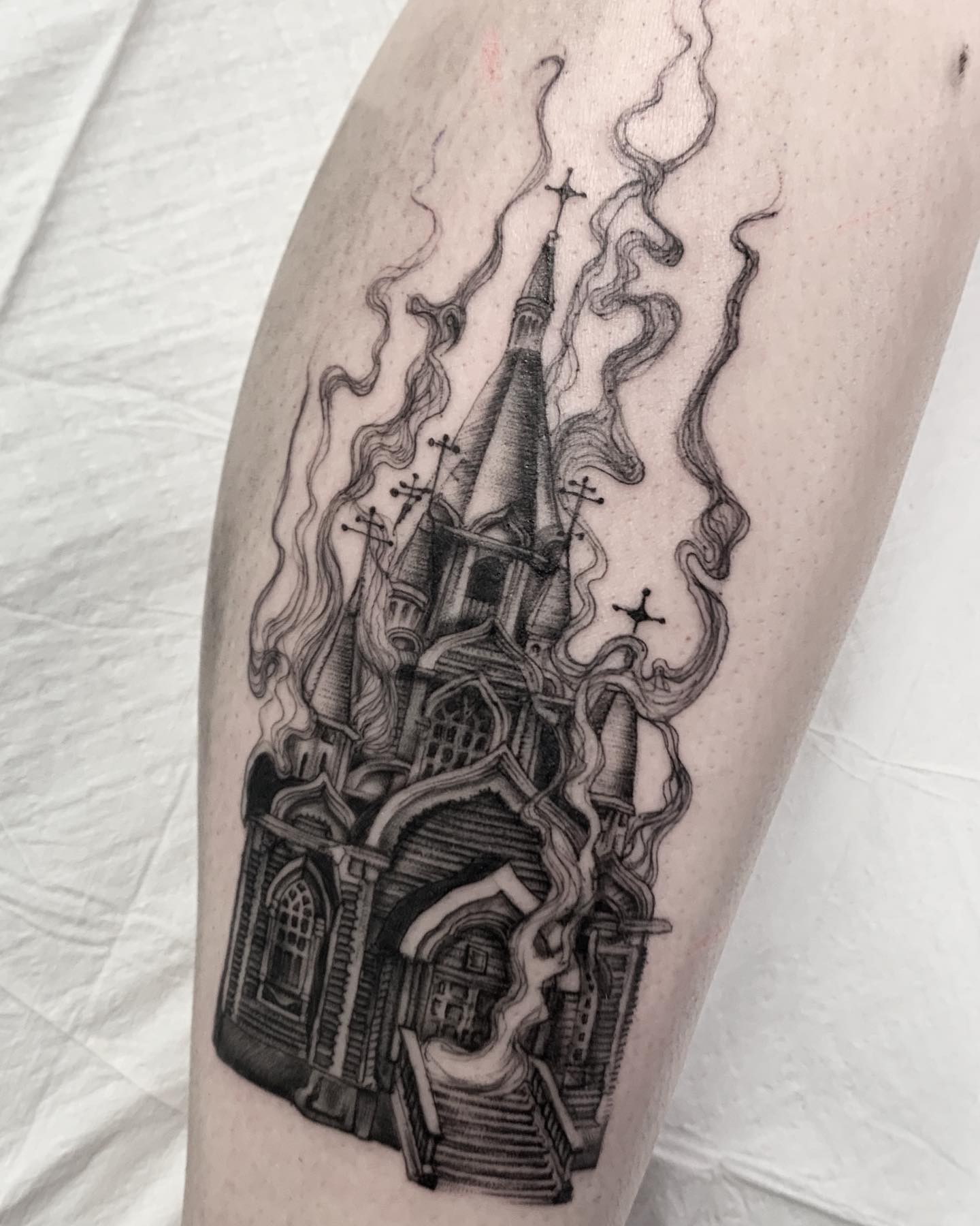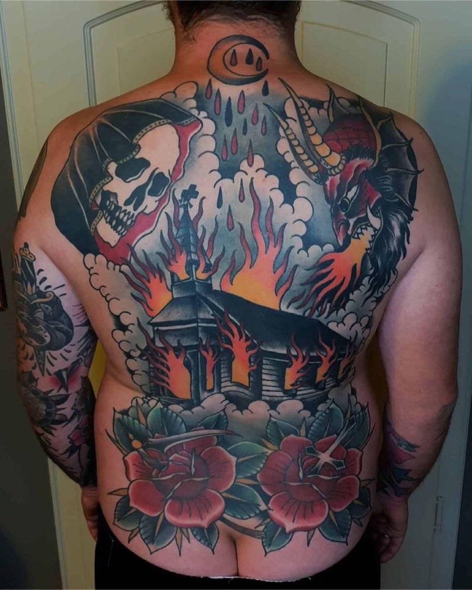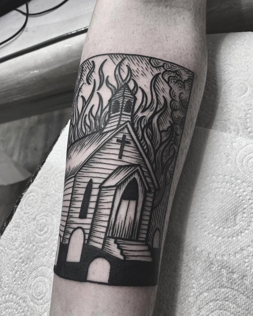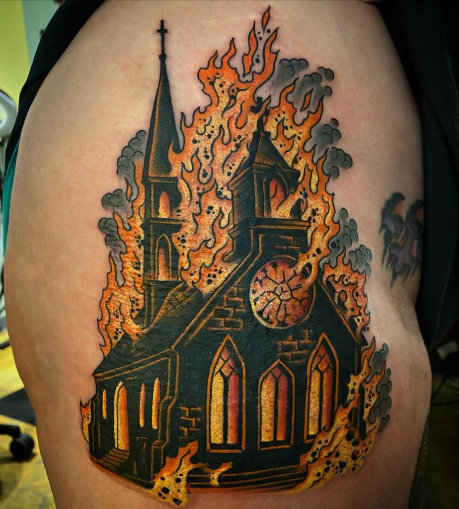 As a tattoo burning churches are usually done as quite a large piece to make a statement. This is often done on full backs, as half sleeves, thigh pieces, or other large areas of skin. They are most often done in American traditional, black and grey and realism styles.