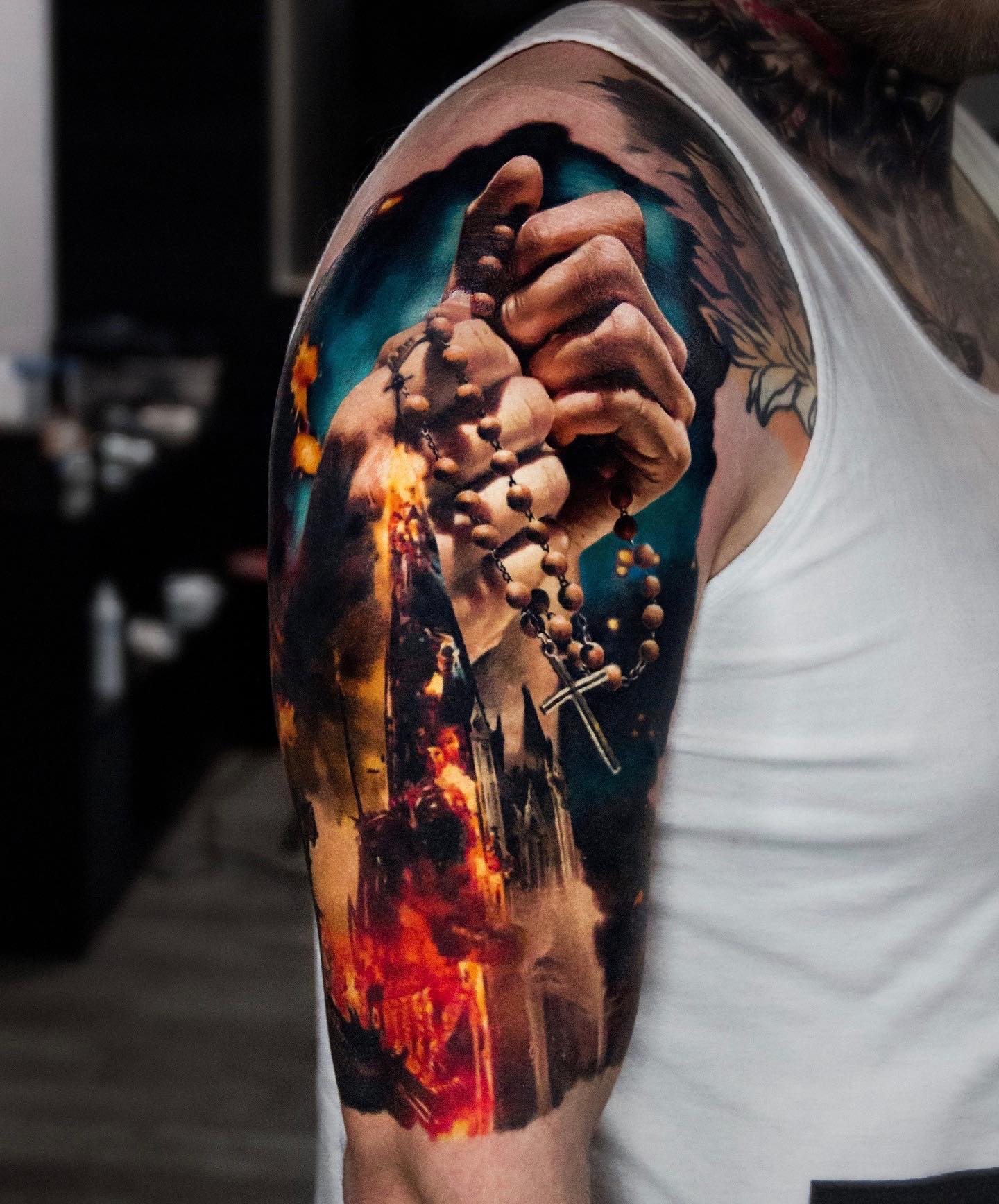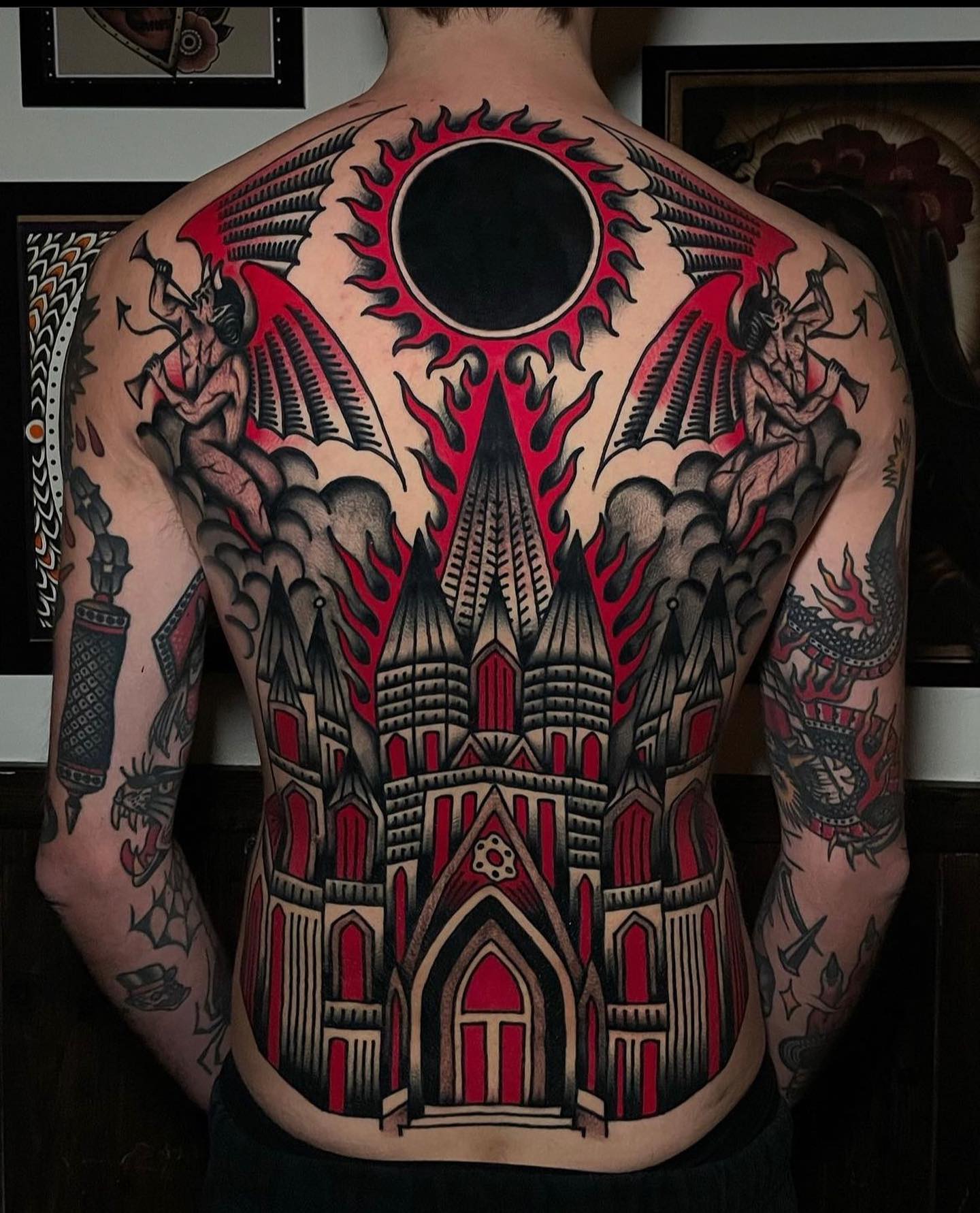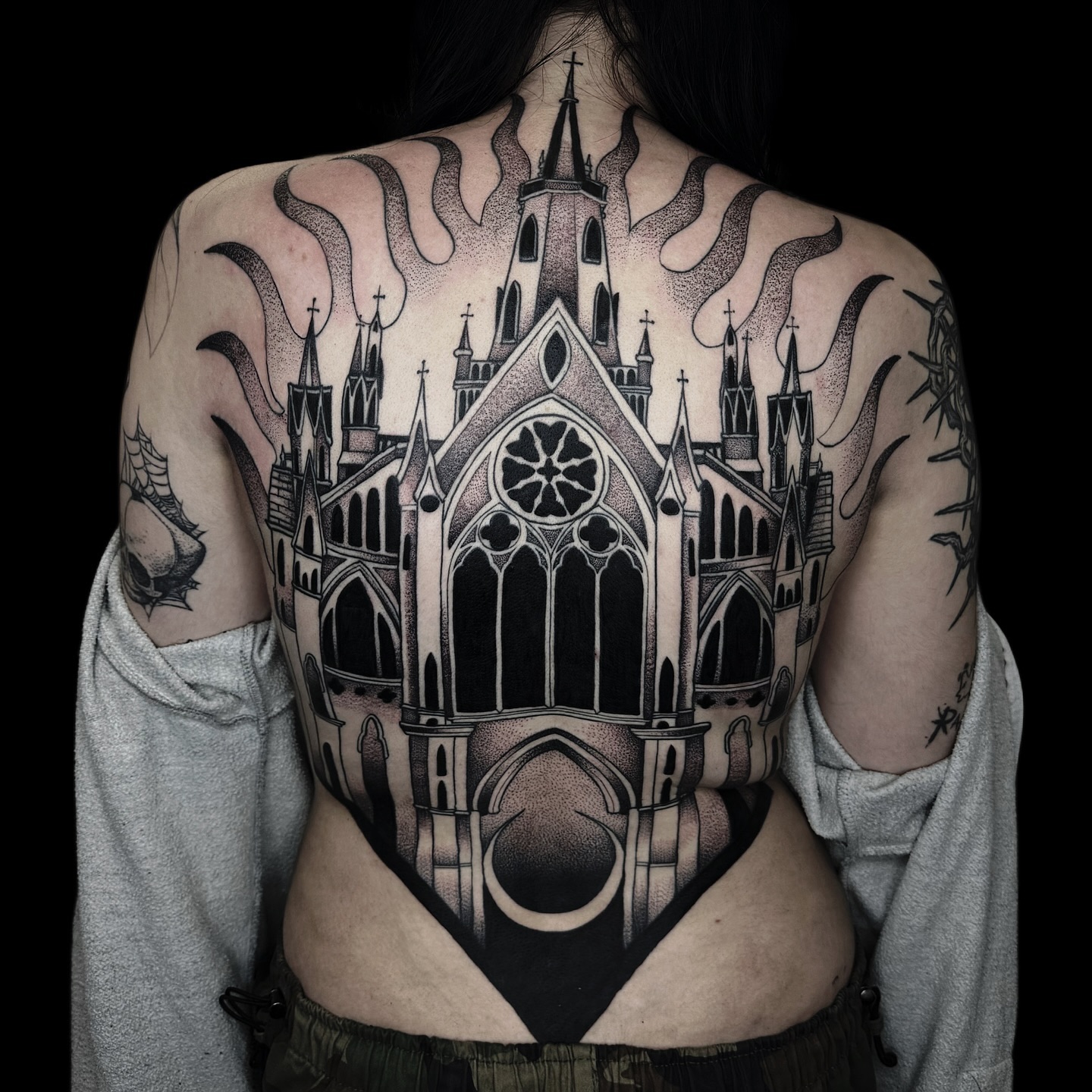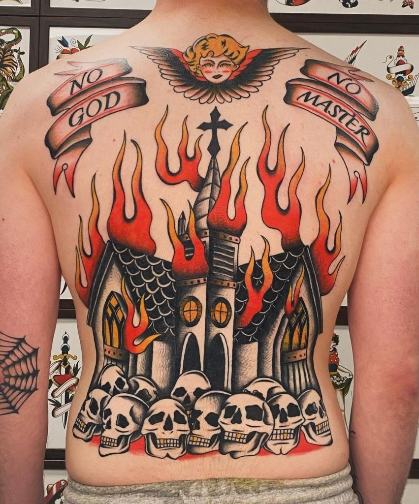 As a tattoo burning churches are usually done as quite a large piece to make a statement. This is often done on full backs, as half sleeves, thigh pieces, or other large areas of skin. They are most often done in American traditional, black and grey and realism styles.