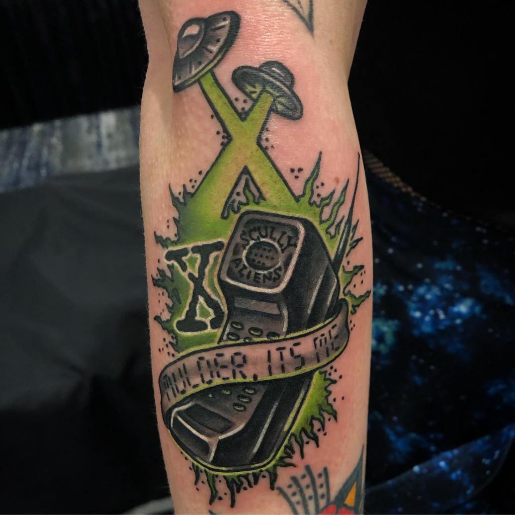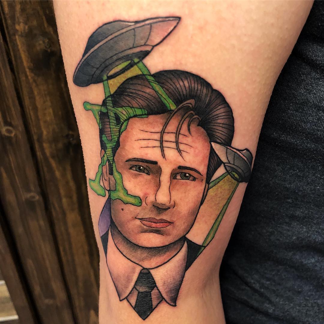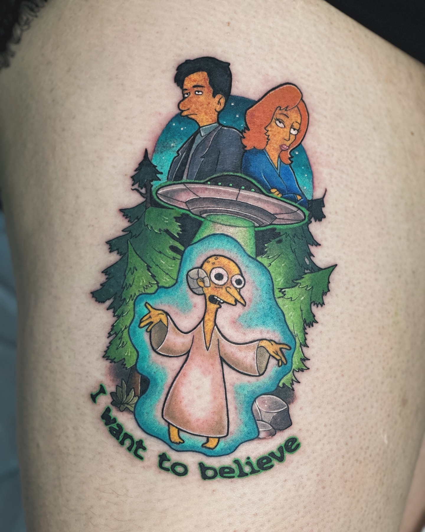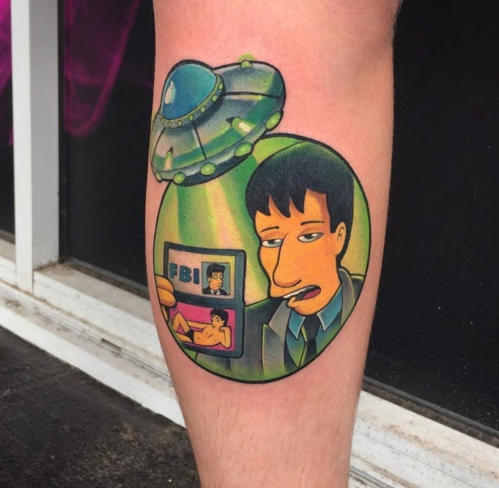 The X Files have also made an appearance on The Simpsons in episode ten of the eighth season titled “The Springfield Files.” This episode is a popular one for tattoo collectors to pull ideas from as it combines a well paired duo of The Simpsons and X Files into one fun design.
