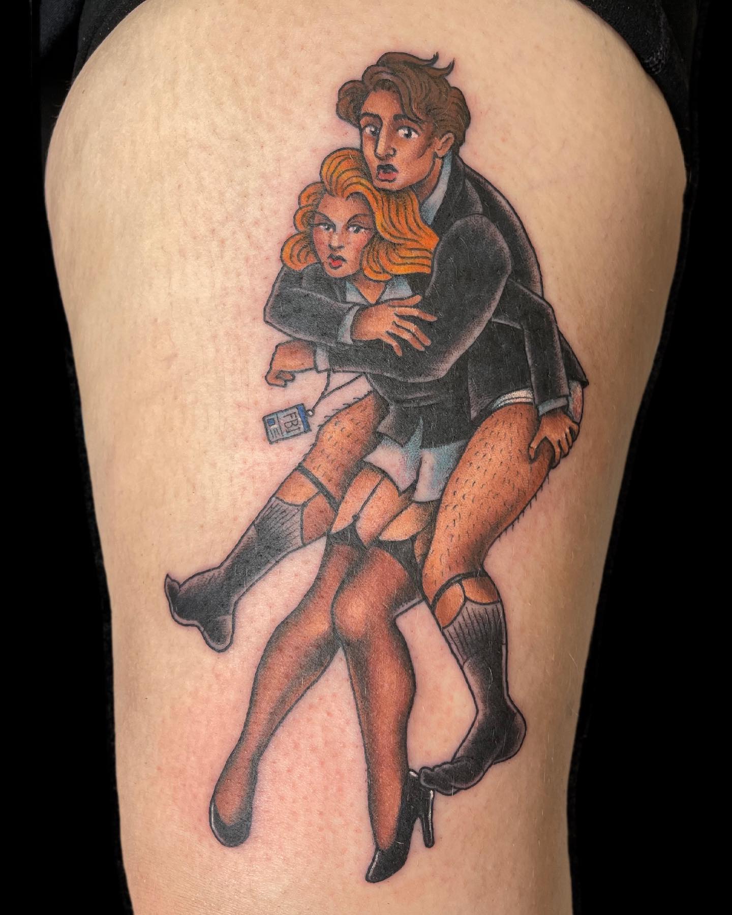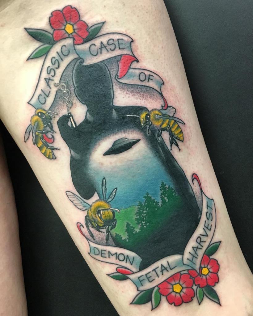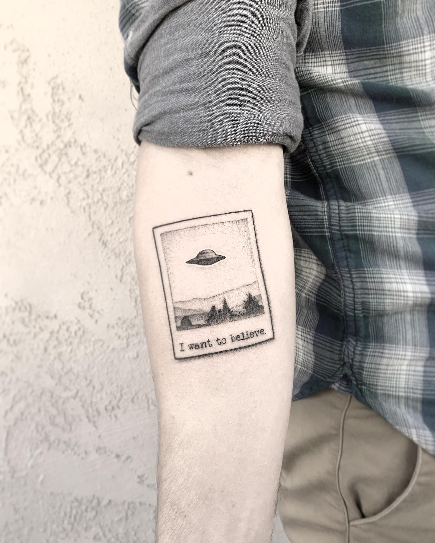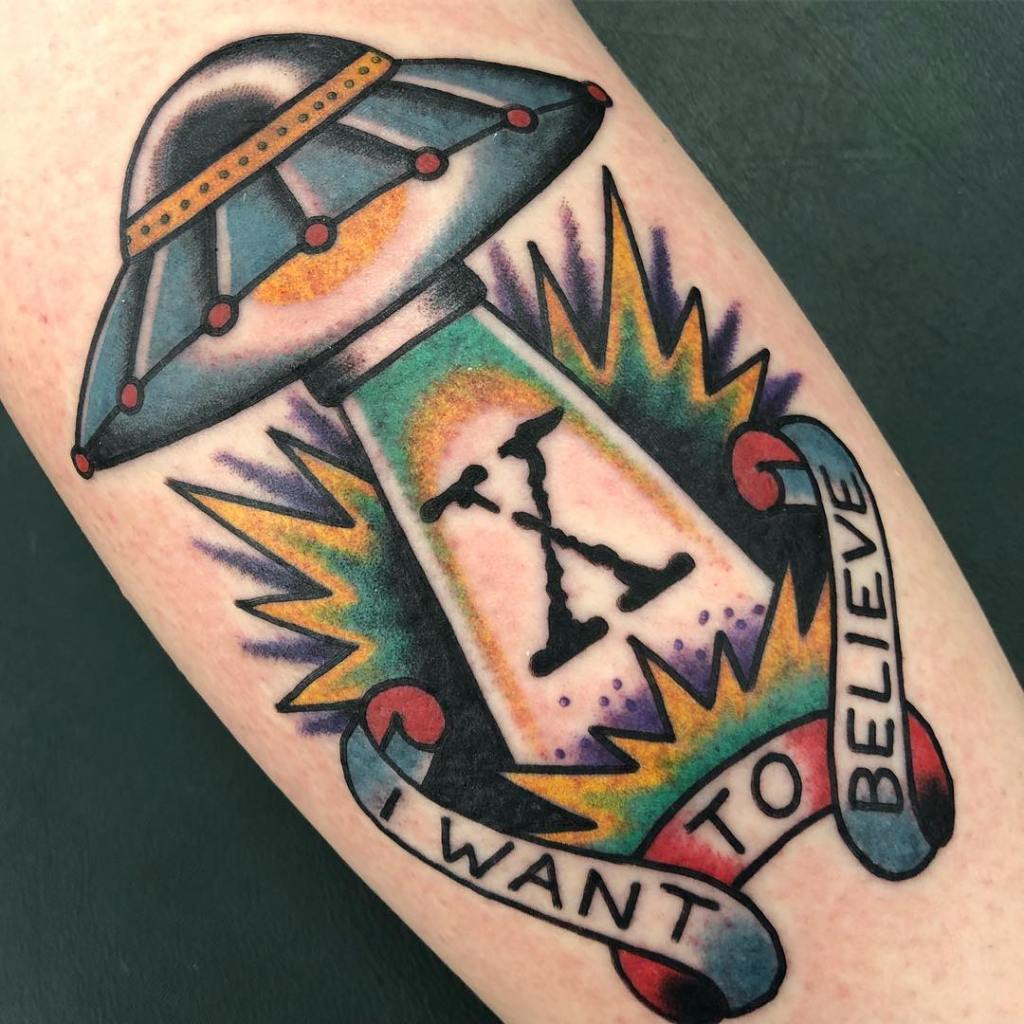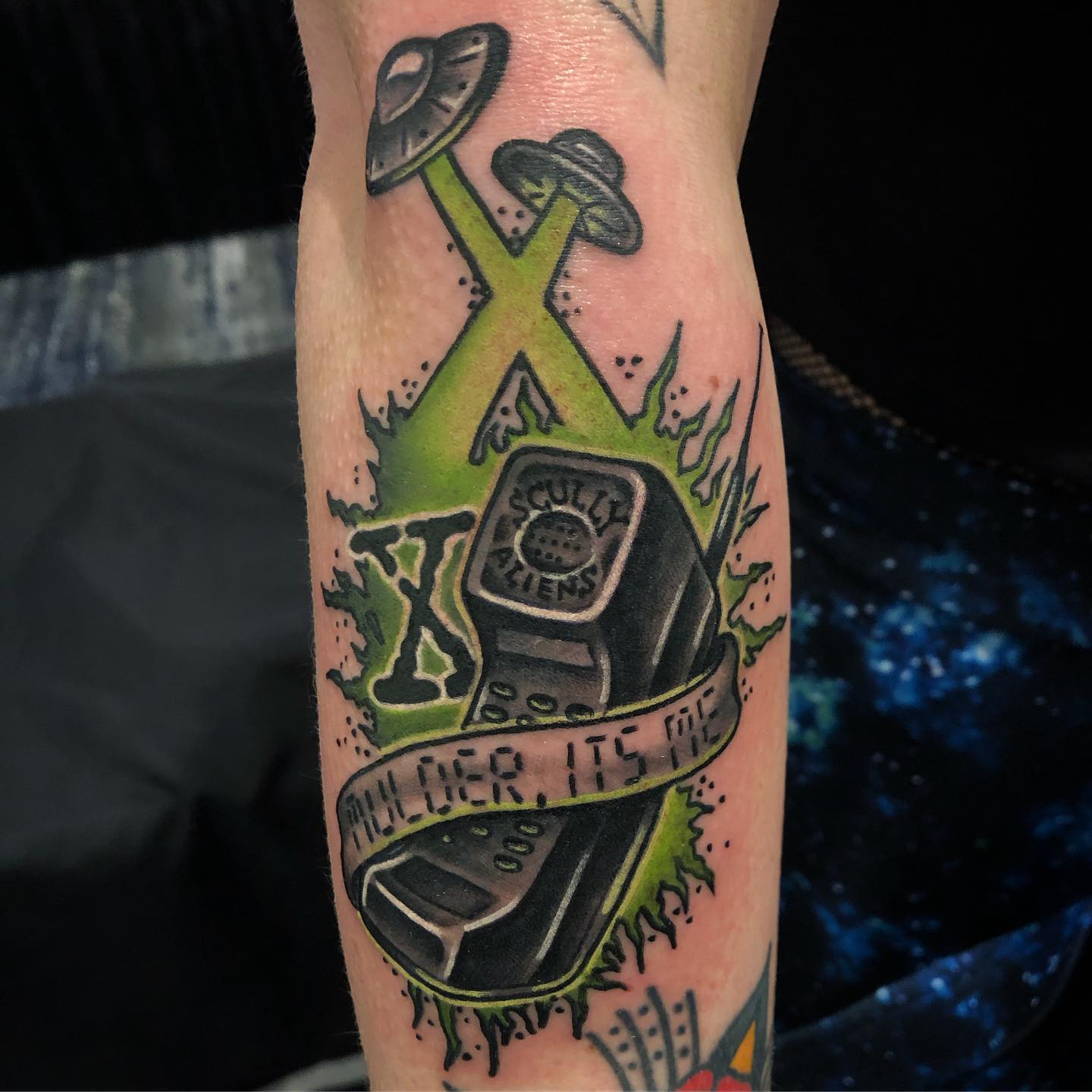 The X Files have also made an appearance on The Simpsons in episode ten of the eighth season titled “The Springfield Files.” This episode is a popular one for tattoo collectors to pull ideas from as it combines a well paired duo of The Simpsons and X Files into one fun design.